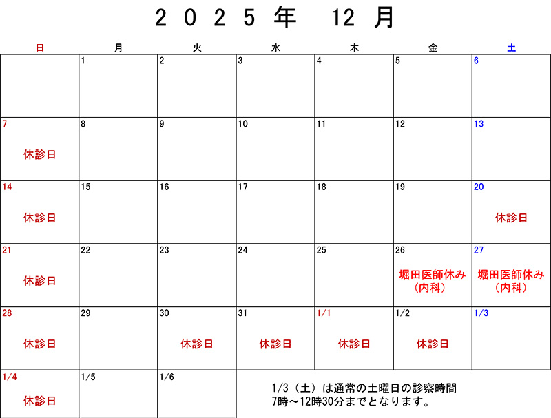 | 診療時間 | 平日 午前7:00~11:00 午後13:30~16:00 土曜 午前7:00~午後12:30 |